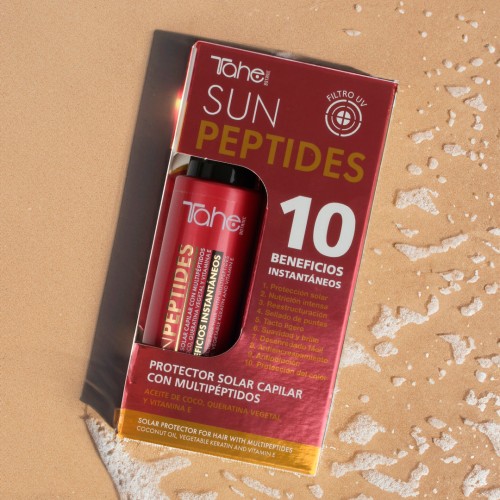 Το Sun Peptides είναι ένα αντηλιακό προϊόν για τα μαλλιά, ειδικά σχεδιασμένο για να τα προστατεύει και να τα φροντίζει όταν εκτίθενται στην ηλιακή ακτινοβολία και τις ελεύθερες ρίζες. Αυτή η πολυδραστική φόρμουλα συνδυάζει τη δύναμη των Πολυπεπτιδίων με λάδι Καρύδας, Φυτική Κερατίνη και Βιταμίνη Ε, προσφέροντας ολοκληρωμένη προστασία και έντονη ενυδάτωση.